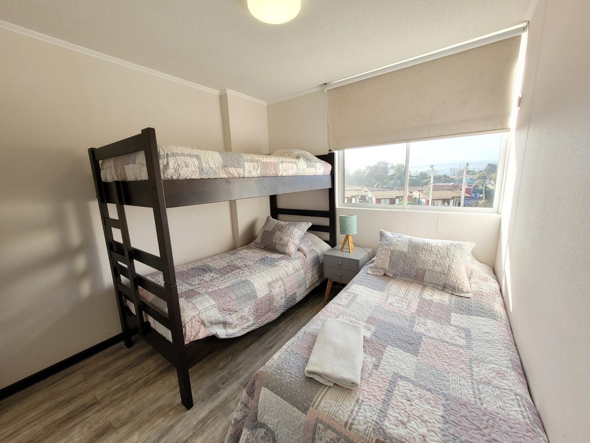 Nice fully equipped apartment for 6 people on the fourth floor with East views. It has 3 bedrooms, one suite and 2 full bathrooms, the second room has a bunk and single bed, the third room has a single bed. You can also find 2 flat screen televisions and internet access. It has a view of the city and at night you can enjoy a beautiful landscape all illuminated from the terrace.