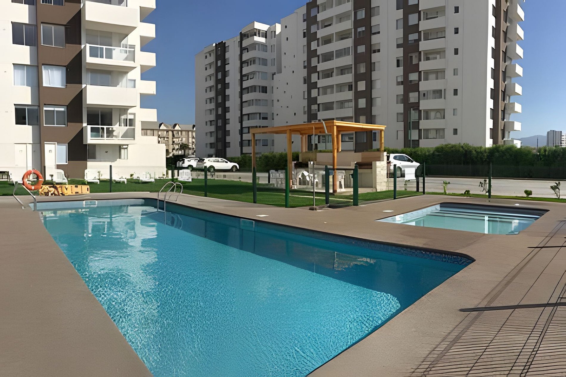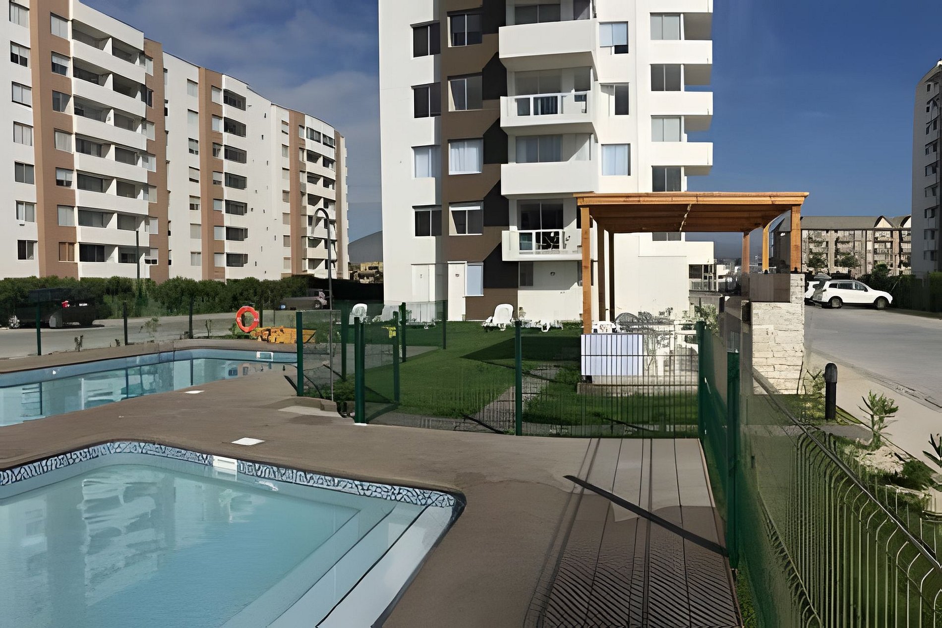 Condominio Pacífico III, posee piscina, quinchos, acceso controlado 24hrs, 2 ascensores, sala de lavandería de pre pago y estacionamientos designado para cada departamento.