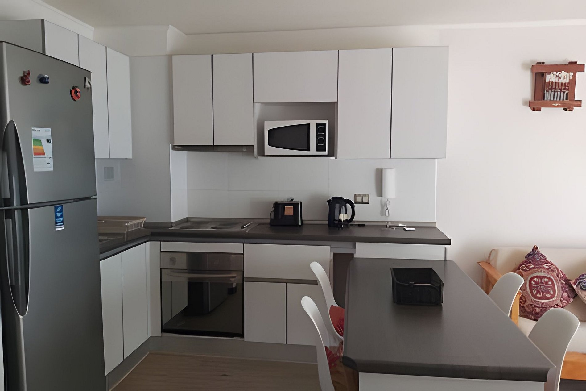 Cómodo departamento en quinto piso de Condominio Pacífico II, ubicado en sector de playa cuatro esquinas. Full equipado para 4 personas, incluye TV cable y WiFi. El departamento cuenta con 2 dormitorios y 2 baños completos, habitación pricipal en suite con cama 2 plazas, segunda habitación con camarote de una plaza, más cocina tipo americana y sala de estar. Linda vista norte hacia la playa y ciudad de La Serena