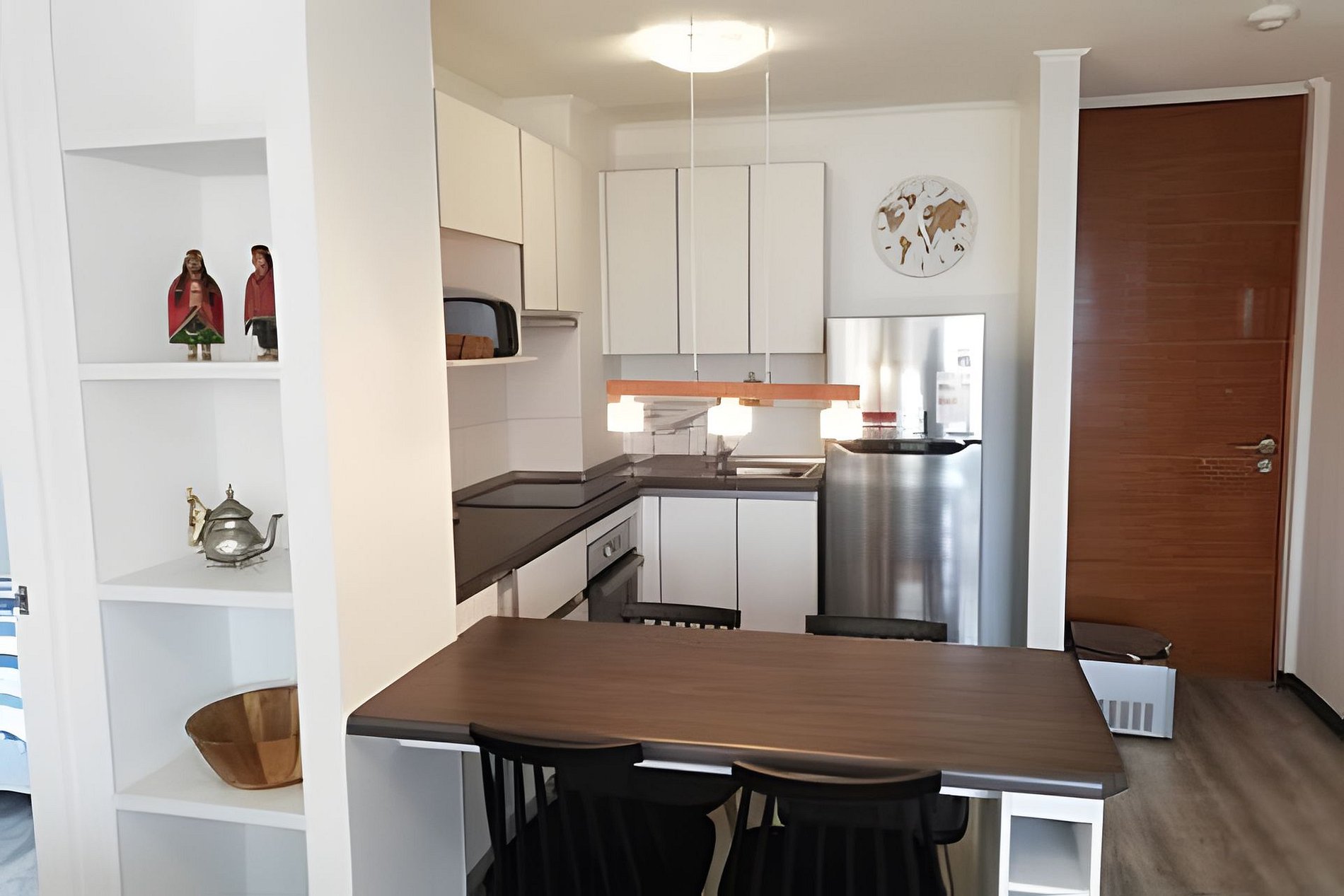 Lindo departamento amoblado para 6 personas. Habitación principal en suite, con tv, baño privado y walking closet. Equipada con cama 2 plazas. Segunda habitación equipada con camarote y cama de una plaza y tercera habitación con cama individual. Segundo baño equipado completamente. Living con TV y Wifi. Cocina americana full equipada para 6 personas Terraza amoblada con mesita para dos. Estacionamiento en superficie. Sector de Cuatro Esquinas cercano a restaurantes y minimarket