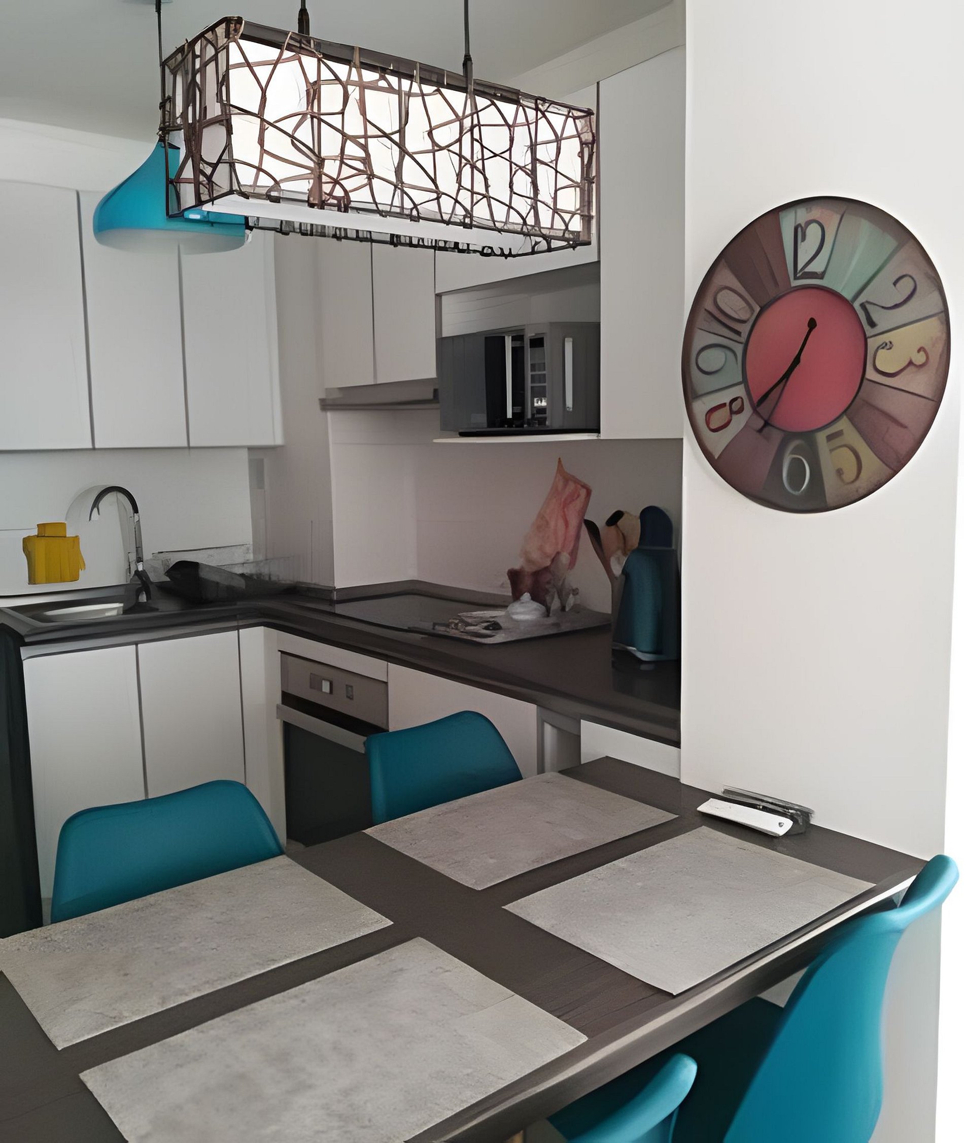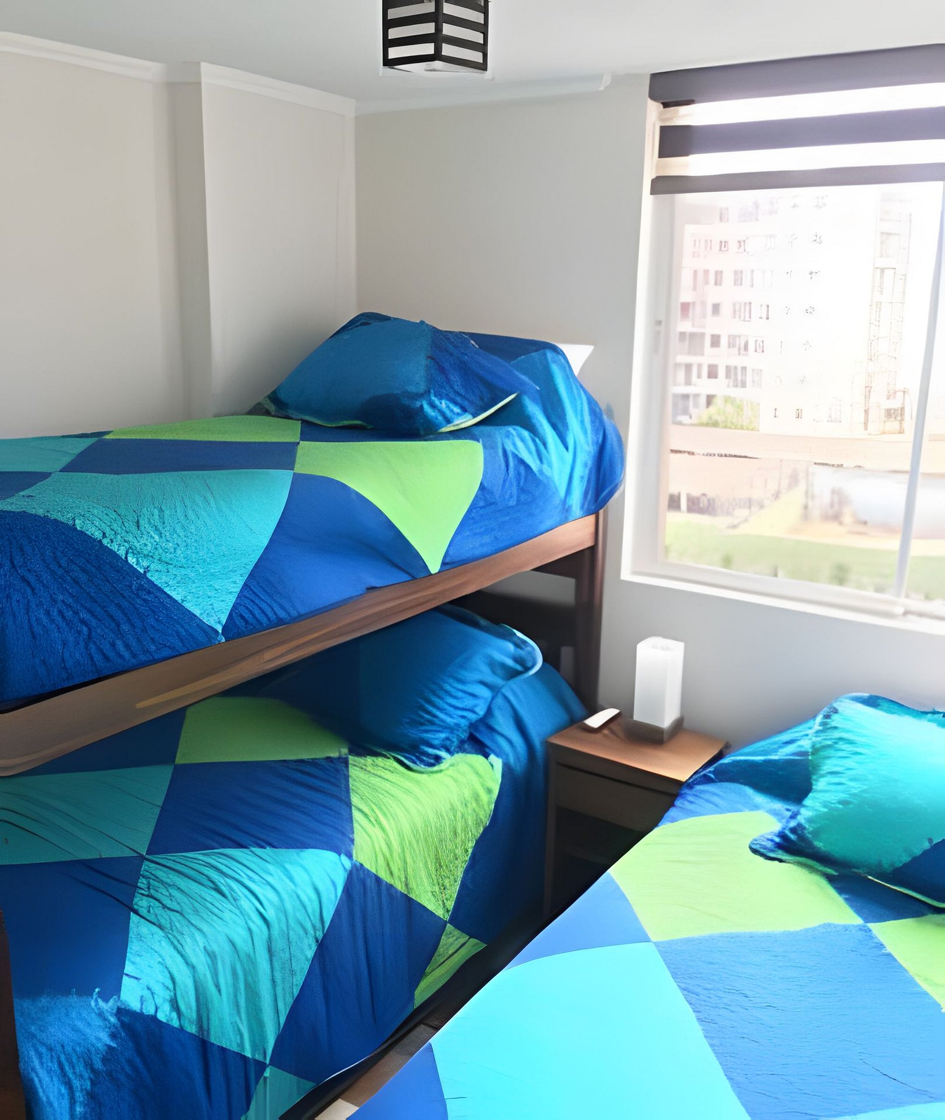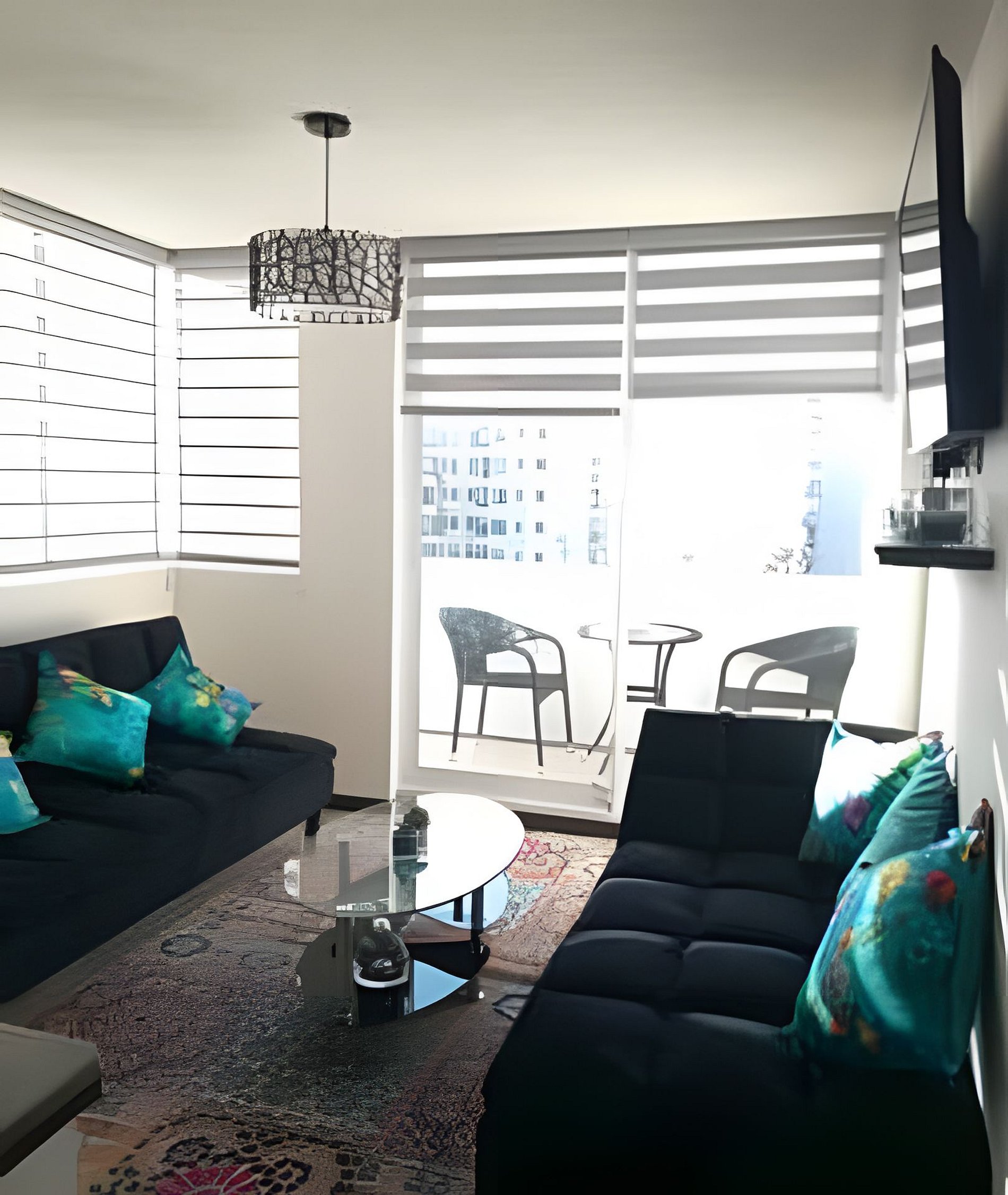 Lindo departamento amoblado para 6 personas. Habitación principal en suite, con tv cable, baño privado y walking closet. Equipada con cama king. Segunda habitación equipada con cama individual más camarote más tv cable, y tercera habitación con cama individual. Segundo baño equipado completamente. Living con TV y Wifi. Cocina americana full equipada para 6 personas Terraza amoblada con mesita para dos. Estacionamiento en superficie. Sector de Cuatro Esquinas cercano a restaurantes y minimarket