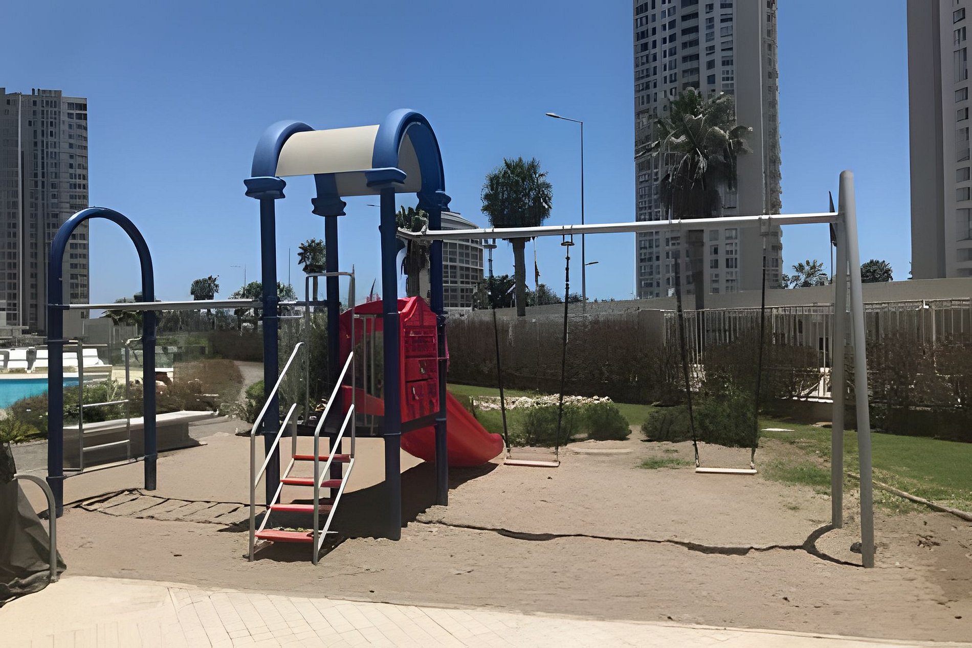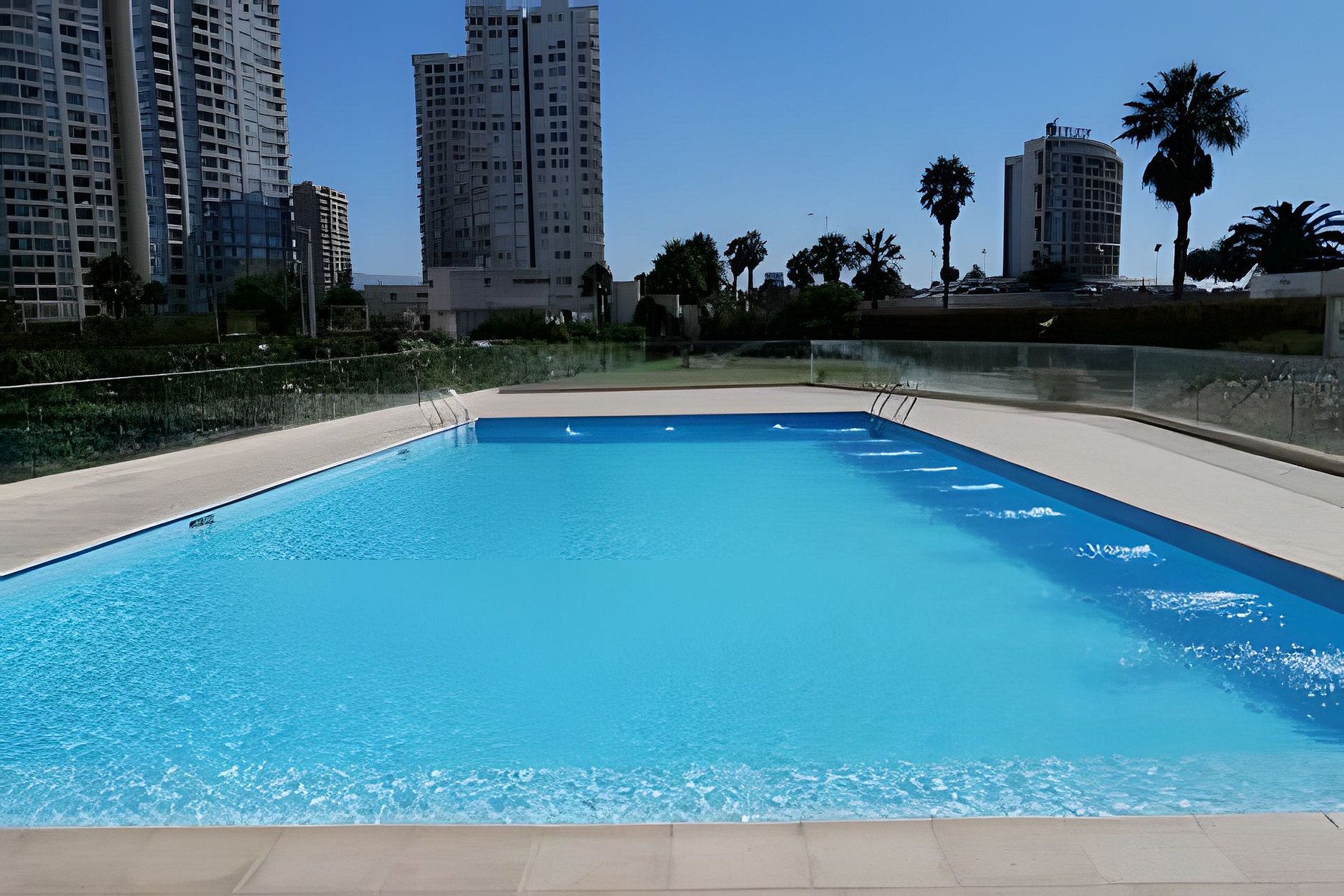 Condominio Marina Oceano posee estacionamiento designado para el departamento, zona quinchos, una linda piscina, ascensores y zona de juegos.