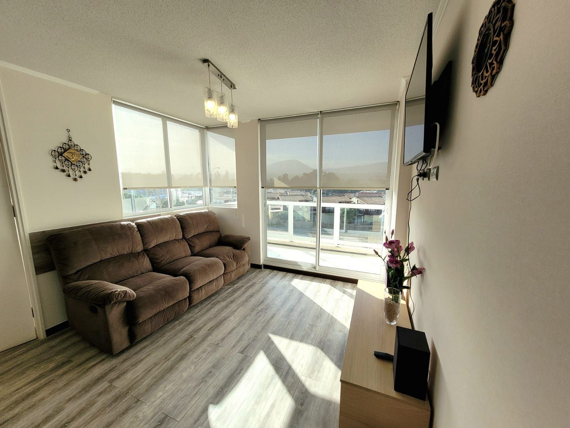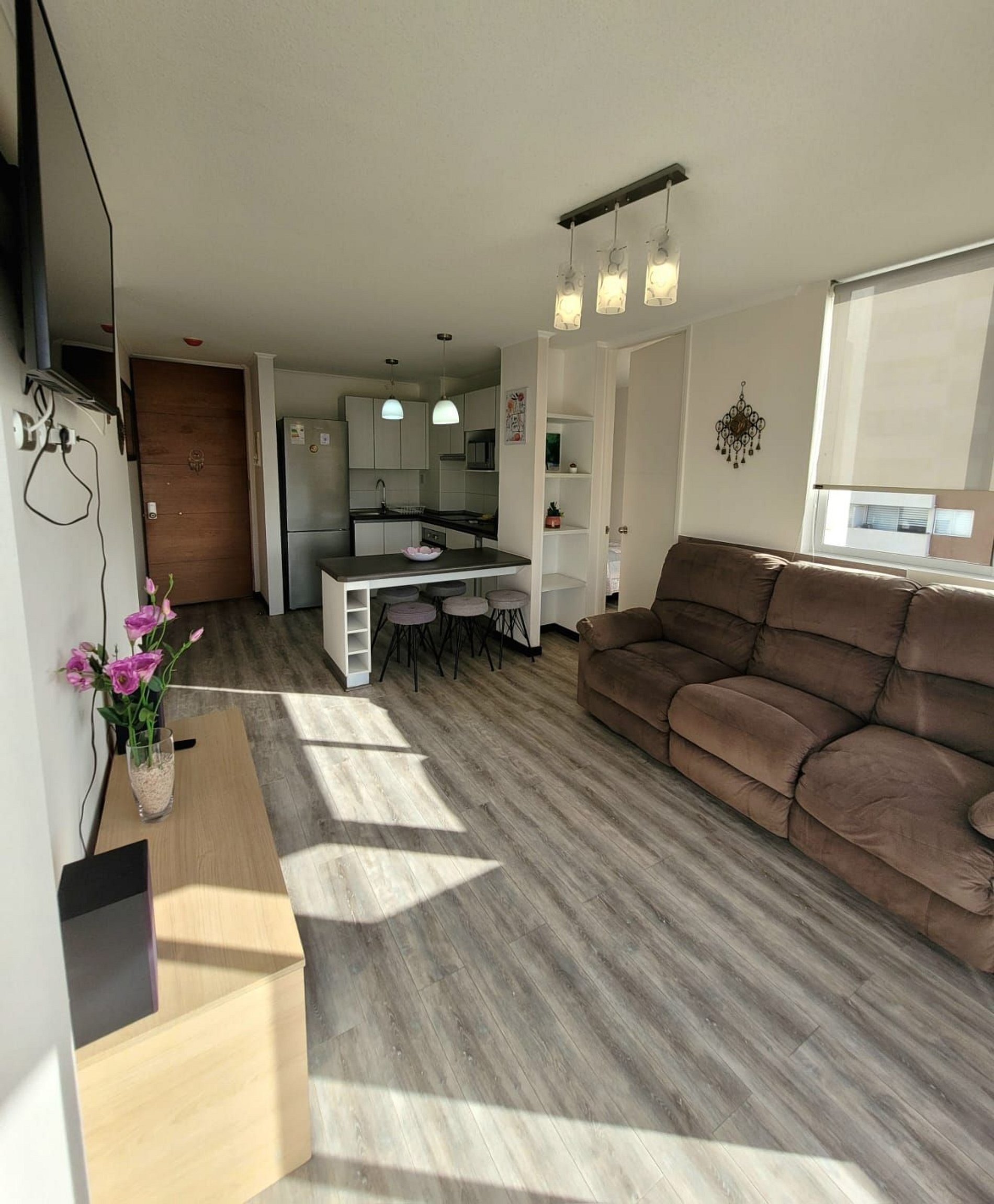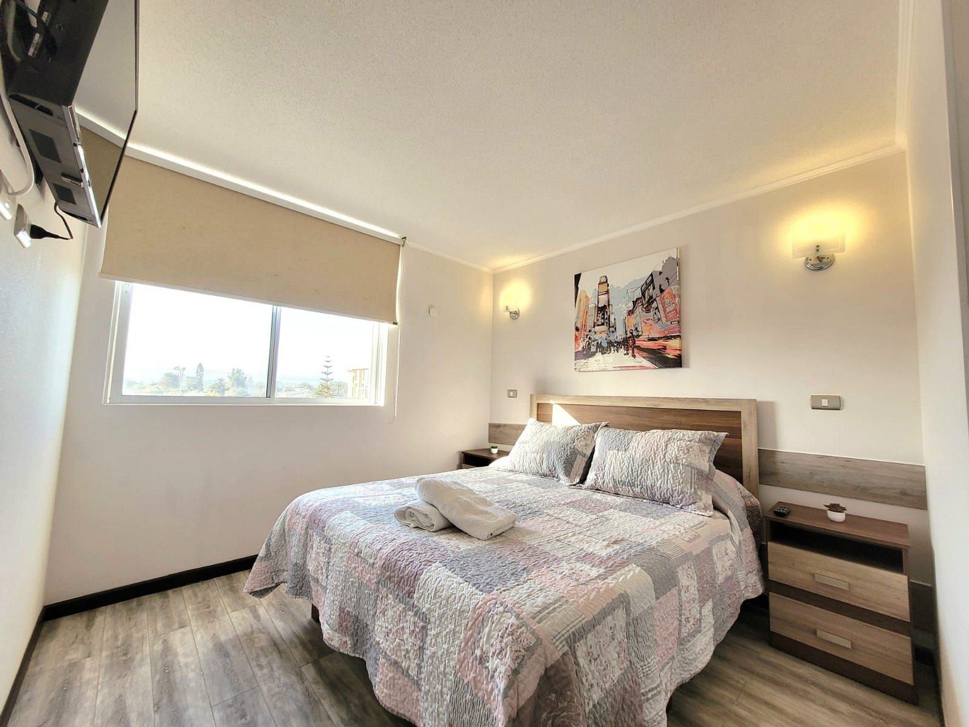 Lindo departamento Full equipado para 6 personas en un cuarto piso con vista Oriente. Posee 3 habitaciones, una en suite y 2 baños completos, la segunda habitación posee un camarote más una cama individual y la tercera habitación una cama individual. Además podrás encontrar 2 televisores pantalla plana y acceso a internet. Tiene vista hacia la ciudad y en la noche podrás disfrutar de un lindo paisaje todo iluminado desde la terraza.
