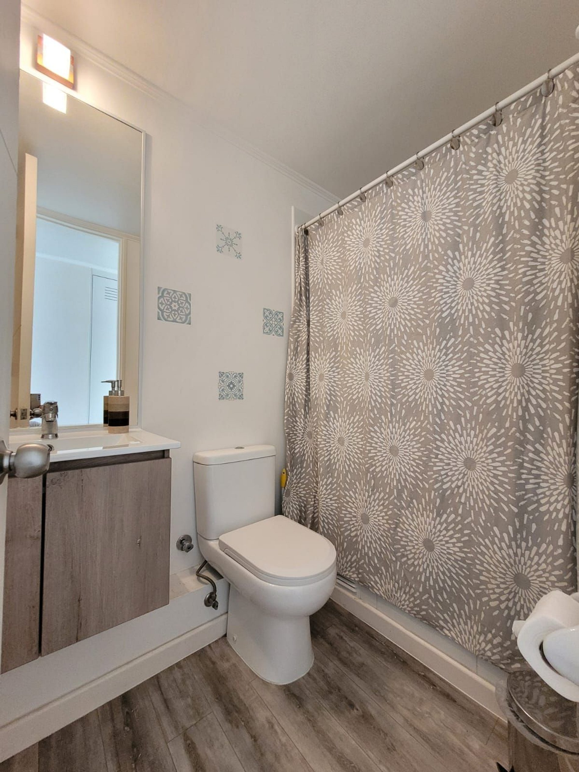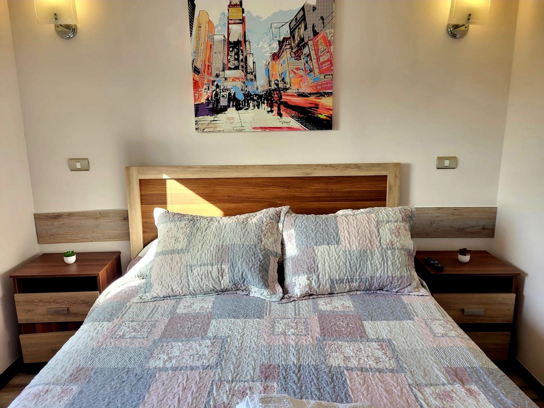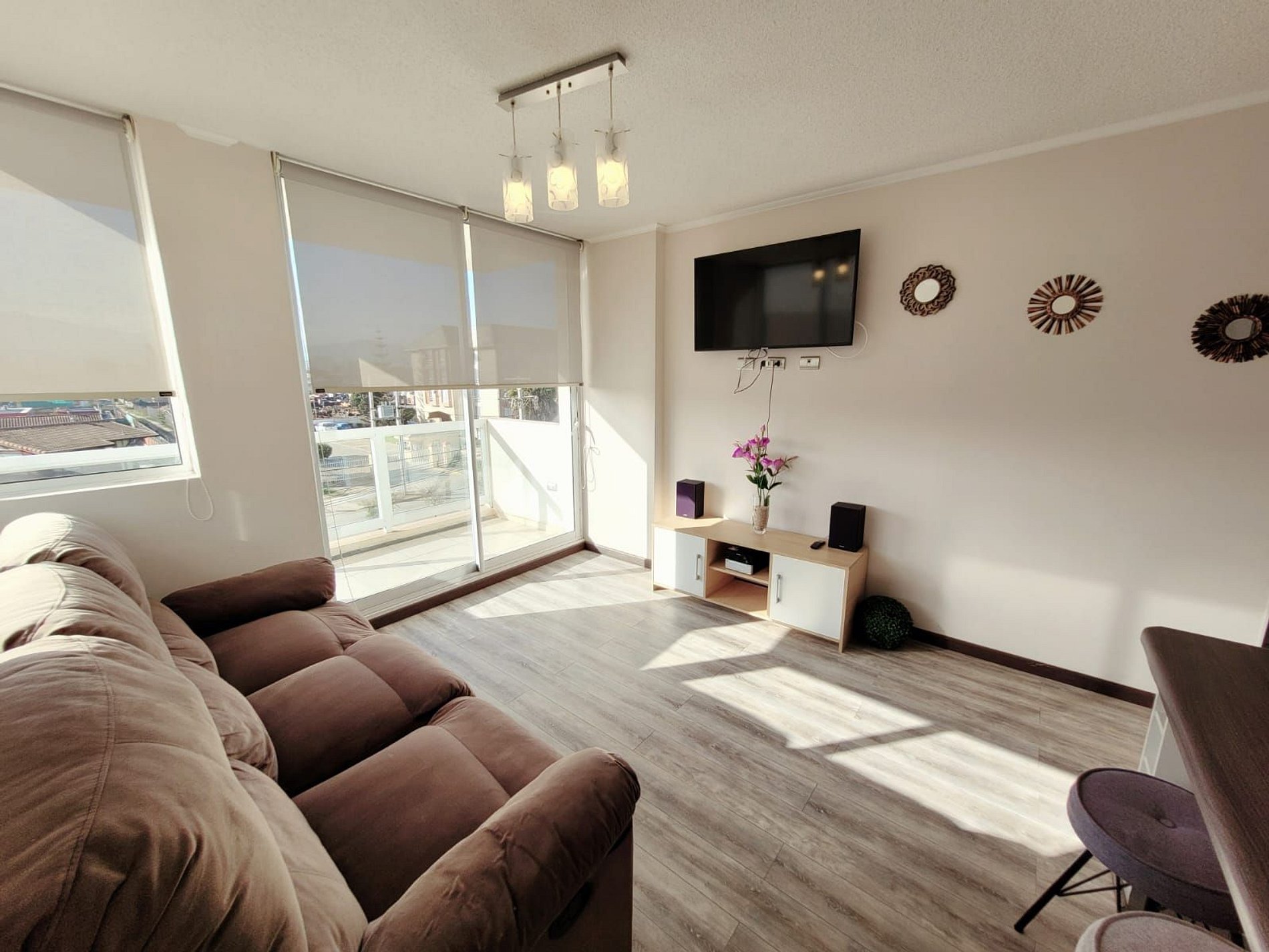 Lindo departamento Full equipado para 6 personas en un cuarto piso con vista Oriente. Posee 3 habitaciones, una en suite y 2 baños completos, la segunda habitación posee un camarote más una cama individual y la tercera habitación una cama individual. Además podrás encontrar 2 televisores pantalla plana y acceso a internet. Tiene vista hacia la ciudad y en la noche podrás disfrutar de un lindo paisaje todo iluminado desde la terraza.
