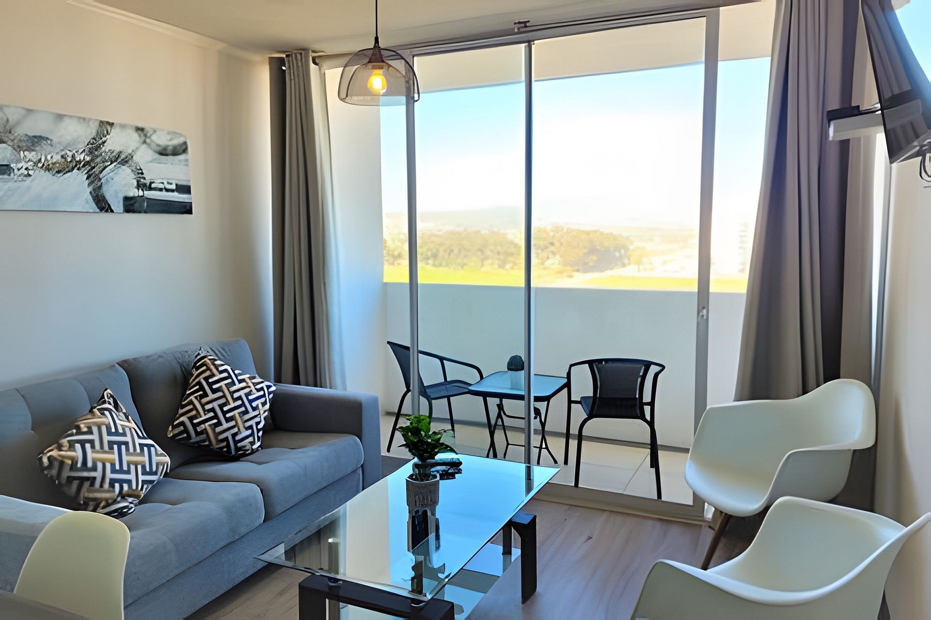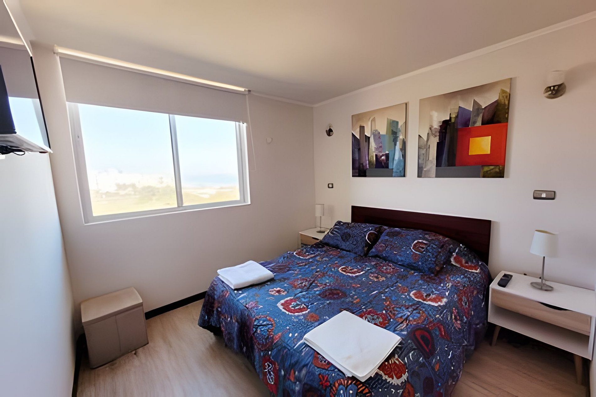 Cómodo departamento en Noveno piso de Condominio Pacífico II, ubicado en sector de playa cuatro esquinas, hermosa vista!!. Full equipado para 4 personas, incluye TV cable y WiFi. El departamento cuenta con 2 dormitorios y 2 baños completos, más cocina tipo americana y sala de estar.