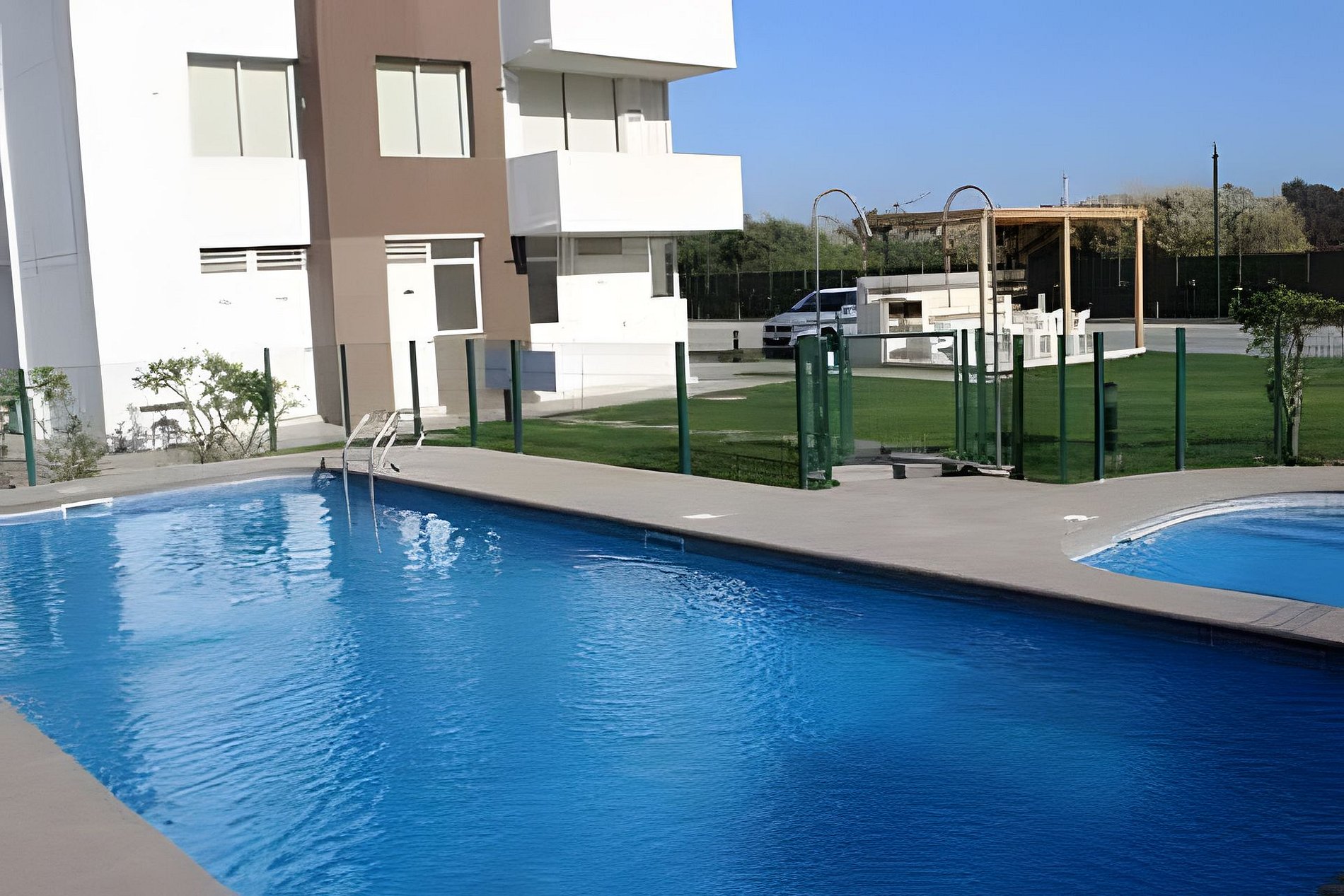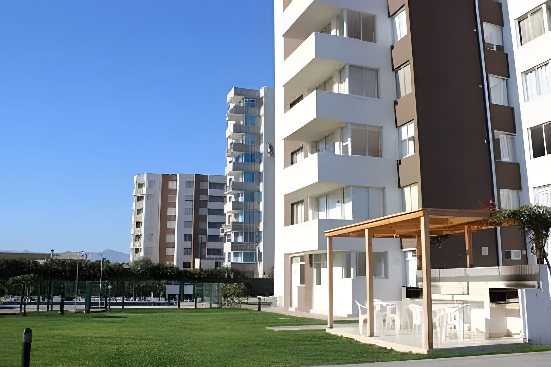 Condominio Pacífico II cuenta con acceso controlado 24 hrs., áreas verdes, piscinas, quinchos, sala de lavandería y sala multiuso de uso gratuito. También cuenta con estacionamiento dentro del condominio designado para cada departamento. Esta ubicado a media cuadra de la playa por lo que puedes llegar fácilmente caminando.