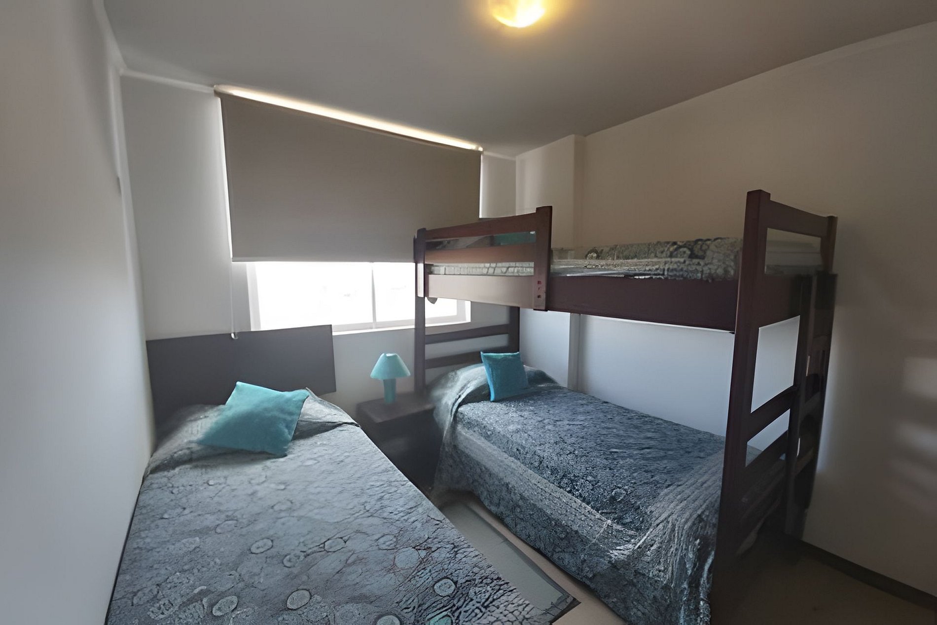 Cómodo departamento en quinto piso de Condominio Pacífico II, ubicado en sector de playa cuatro esquinas. Full equipado para 5 personas, incluye TV cable y WiFi. El departamento cuenta con 2 dormitorios y 2 baños completos, más cocina tipo americana y sala de estar. Posee televisor en habitacion en suite y el segundo en living comedor.
