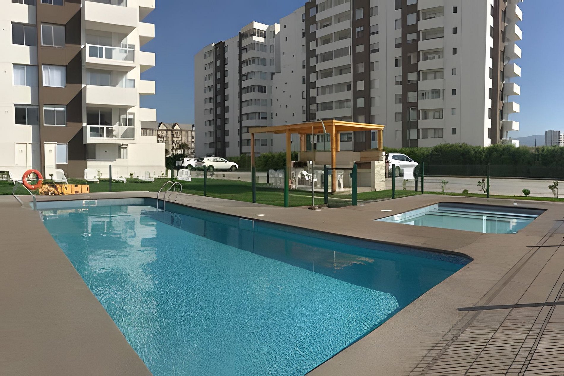 Condominio Pacífico III, posee piscina, quinchos, acceso controlado 24hrs, 2 ascensores, sala de lavandería de pre pago y estacionamientos designado para cada departamento.