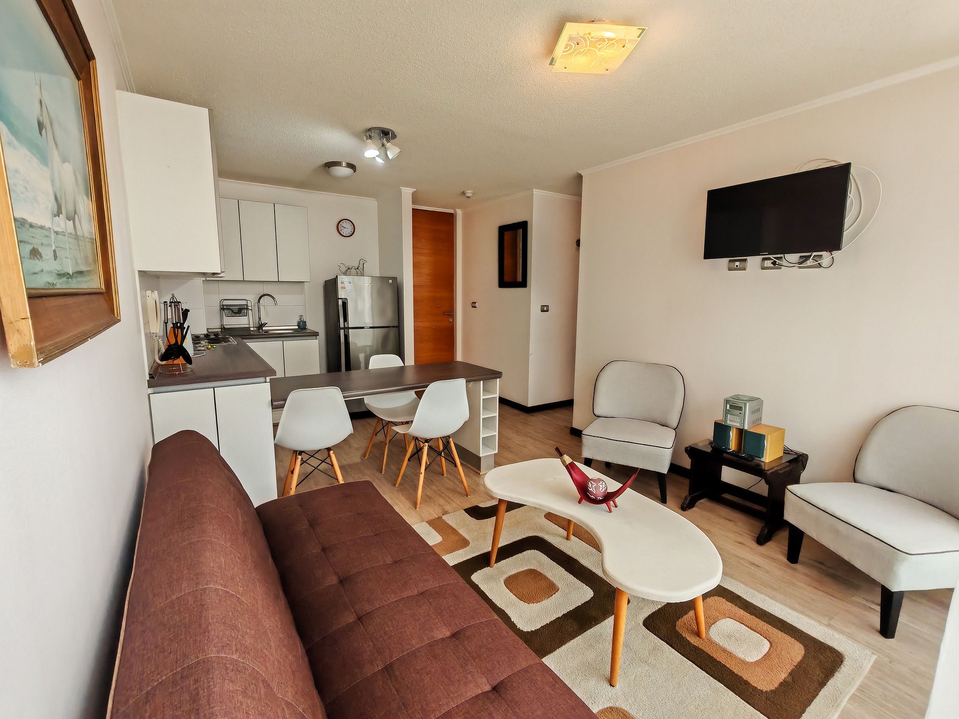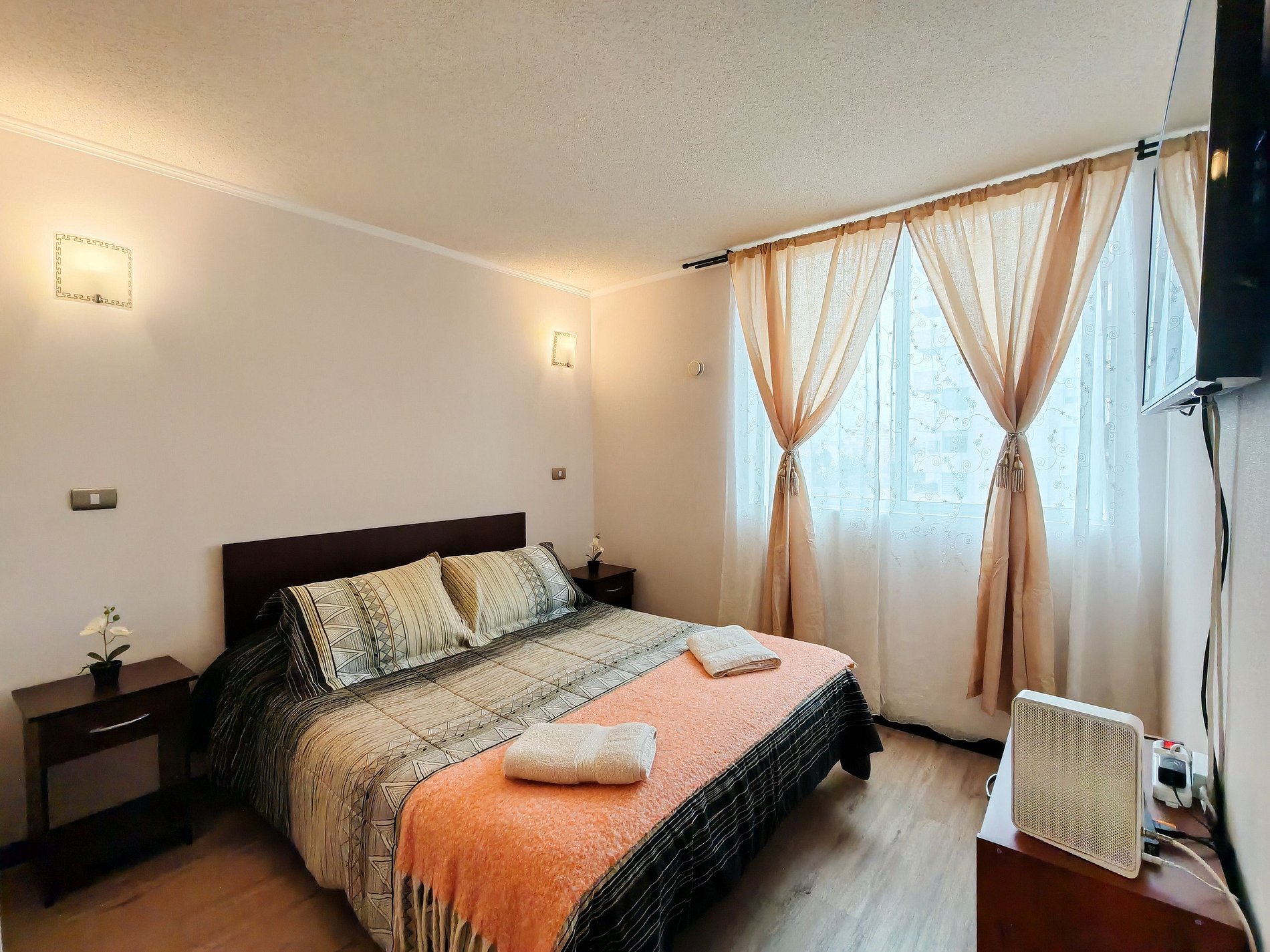 Cómodo departamento en sexto piso de Condominio Pacífico II, ubicado en sector de playa cuatro esquinas. Full equipado para 4 personas, incluye TV cable y WiFi. El departamento cuenta con 2 dormitorios, uno en suite y 2 baños completos. Cada habitación posee su propio televisor además del ubicado en la sala de living. Tiene orientación norte por lo que disfruta del sol gran parte del día.